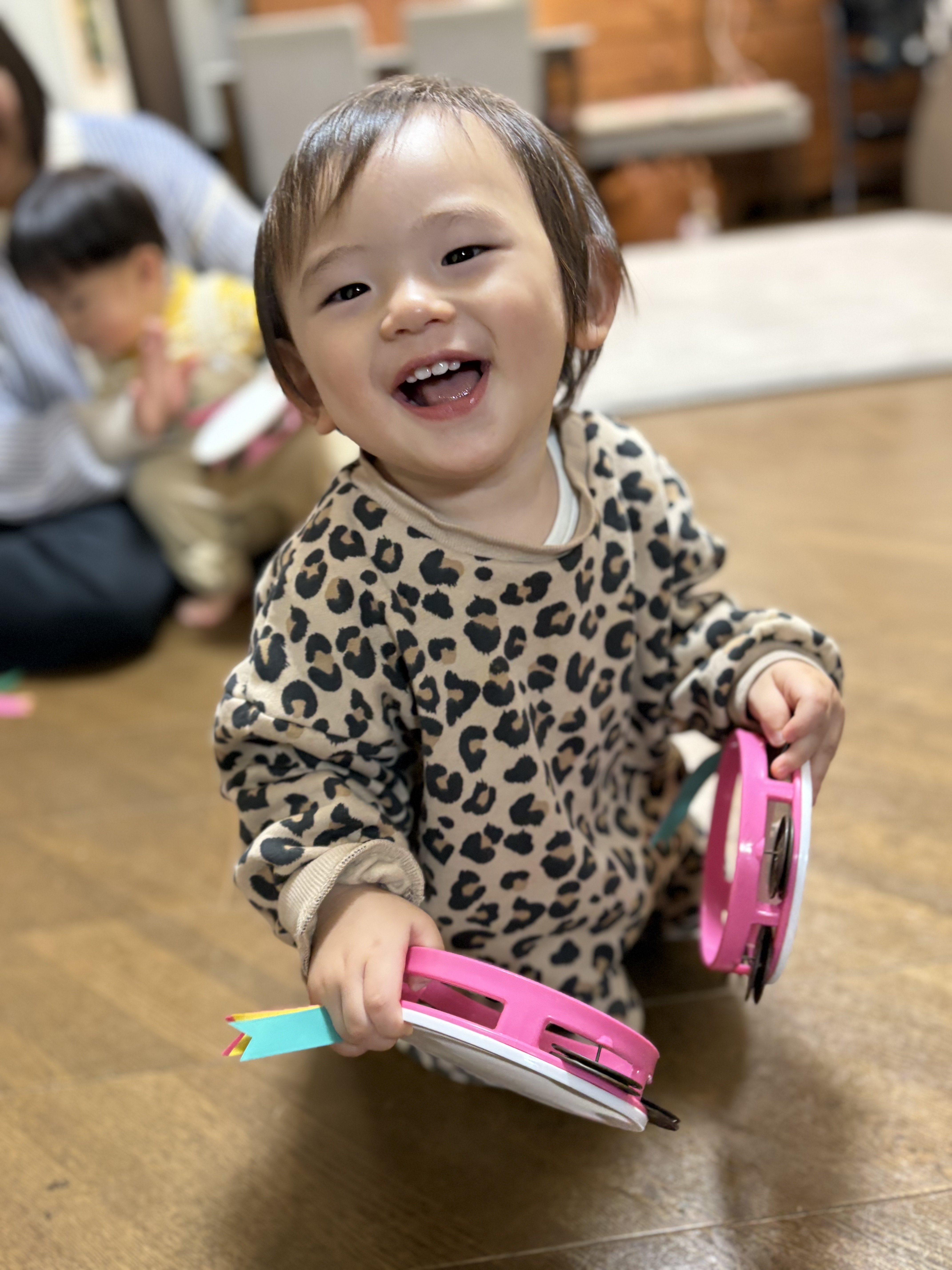 0歳児のリトミックのお友だちの様子です。 タンブリンをもらって嬉しそうにしています。 この時期は、なんでも真似っこしながら色々な事を覚えていきます。